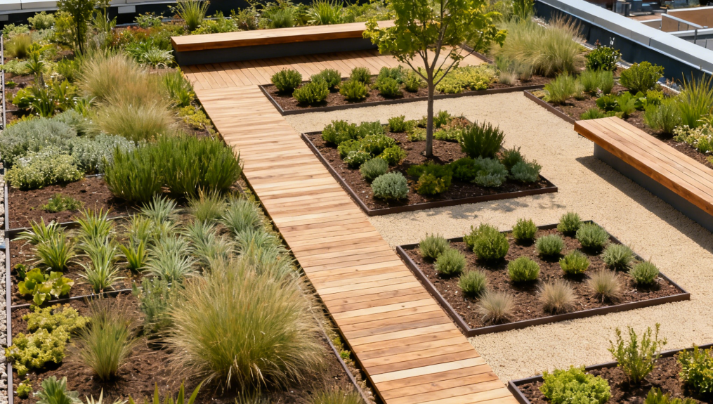 多重绿化是指通过搭配不同高度的植被,形成丰富而立体的景观层次。典型的五重绿化包括:第一层地被植物,第二层花卉,第三层低矮灌木,第四层小乔木或大灌木,第五层为大乔木。